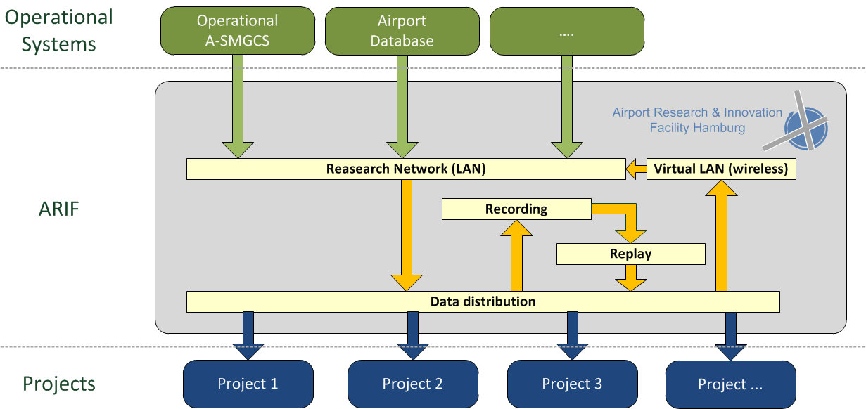 A reserved wireless network segment is provided by Hamburg Airport as part of the research network. It can be used for datalink based research activities using mobile system components. The following figure presents an overview of the technical setup of the ARIF.
