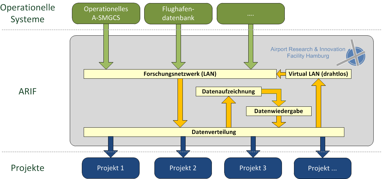 Die ARIF stellt ein Framework zur Verfügung, dass es ermöglicht, Forschungs- und Entwicklungsprojekte mit Real- und Livedaten durchzuführen, ohne operationellen Betrieb und Systeme zu stören. Beim Aufbau des operationellen A-SMGCS wurde dazu eine Erweiterung implementiert, die die Daten an das Forschungsnetzwerk liefert. Die integrierte Schnittstelle ist unidirektional und entsprechend abgesichert, so dass eine Rückkopplung zum operationellen System ausgeschlossen ist und Beeinträchtigungen im Betrieb vermieden werden. Unter Nutzung standardisierter Datenaustauschformate stehen in der ARIF nicht nur fusionierte Positionsdaten, sondern auch umfangreiche Einzelinformationen des A-SMGCS zur Verfügung. Hierzu gehören bspw. Informationen von Einzelsensoren oder Warnungen (A-SMGCS Level 2).